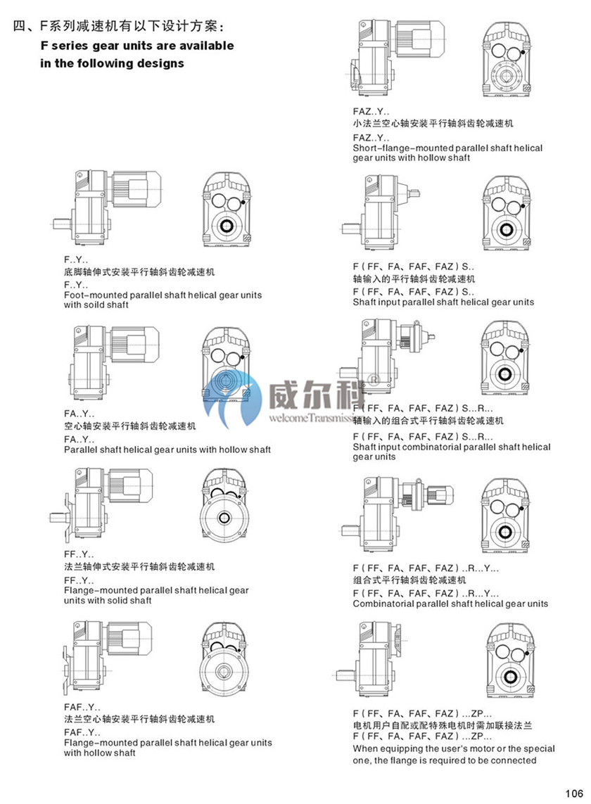 F系列平行軸斜齒輪減速機,結(jié)合國際技術(shù)要求制造 ,具有很高的科技含量,節(jié)省空間,可靠耐用,承受過載能力高,功率可90KW一上,能耗低,性能優(yōu)越,減速機效高達(dá)95%以上 ,振動小嗓音低,節(jié)能高,選用優(yōu)質(zhì)鍛鋼材料,鋼性鑄鐵箱體,齒輪表面經(jīng)過高頻熱處理,經(jīng)過精密加工, 確保軸平行度和定位的精度,這一切構(gòu)成了齒輪傳動總成的減速機配置了各種類電極,形成了電極一體化,完全保證了產(chǎn)品使用質(zhì)量特性