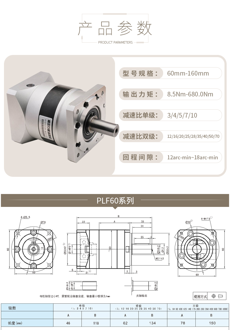 行星減速機(jī)特點(diǎn):產(chǎn)品全面升級(jí),采用前后油封,齒輪配件日本進(jìn)口,國(guó)際知名品牌NSK軸承,具有高精度、高鋼性、高負(fù)載、高效率、高速比、高壽命、低慣性、低振動(dòng)、低噪音、低溫升、外觀美、結(jié)構(gòu)輕小、安裝方便、精確定位等特點(diǎn),適用于交流伺服馬達(dá)、直流伺服馬達(dá)、步進(jìn)馬達(dá)、液壓馬達(dá)的增速與減速傳動(dòng)。能與任何電機(jī)匹配安裝(如松下,安川,三菱,西門子,富士,臺(tái)達(dá),東元,臺(tái)安,匯川,信捷,埃斯頓......)電機(jī)不同,與之匹配的尺寸將有所變化,適配器將不同,配特殊電機(jī)可以訂做??!